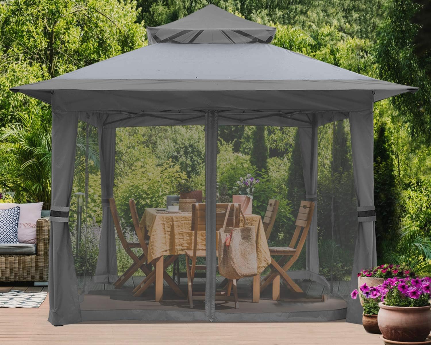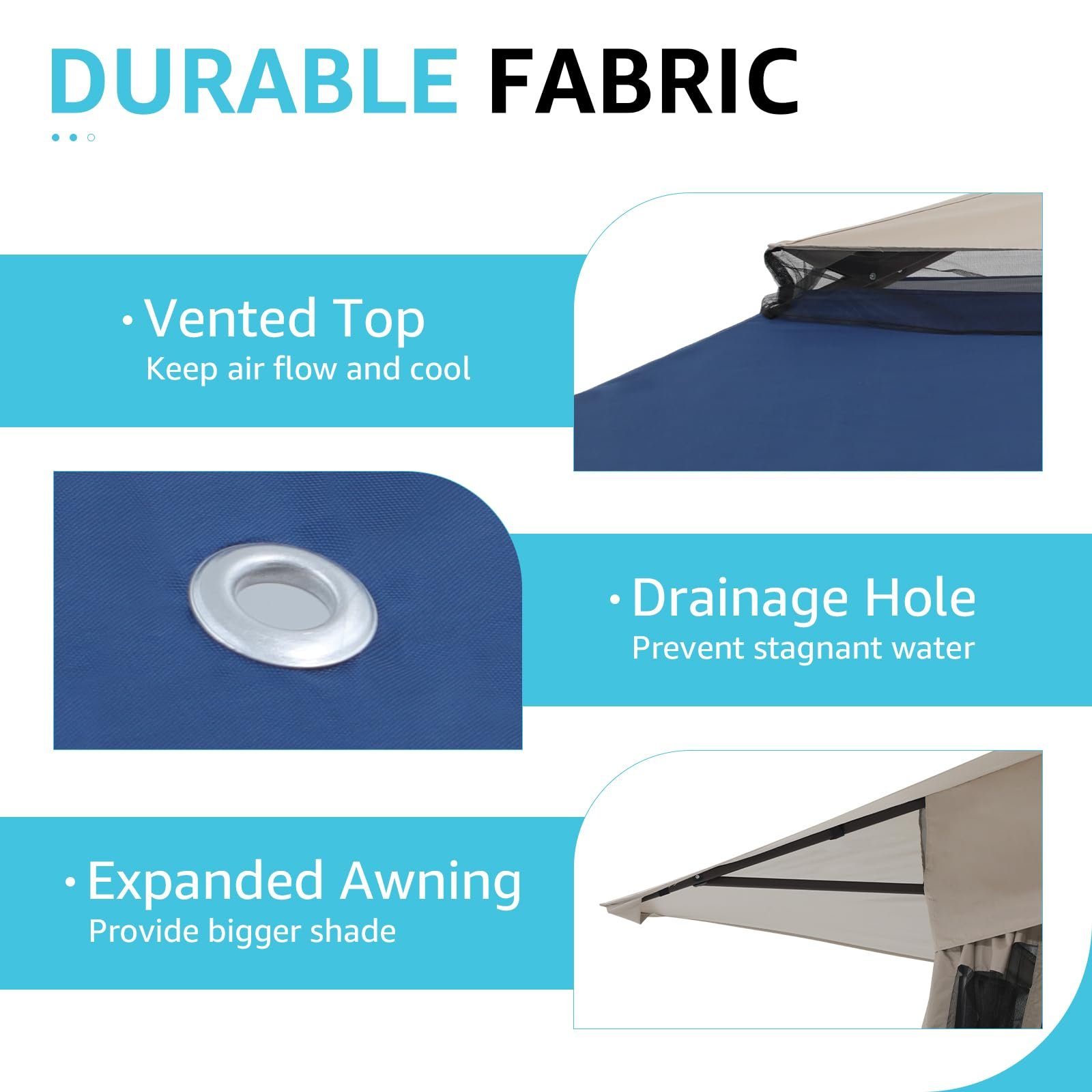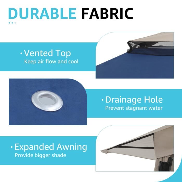 - Double Roof Design-2-tier canopy top with a wind vent, helps to enhance the air circulation inside the gazebo and provides the gazebo with more stability. With 4 drain holes on the fabric, will not hold water, keeping this shelter always dry for a longer service