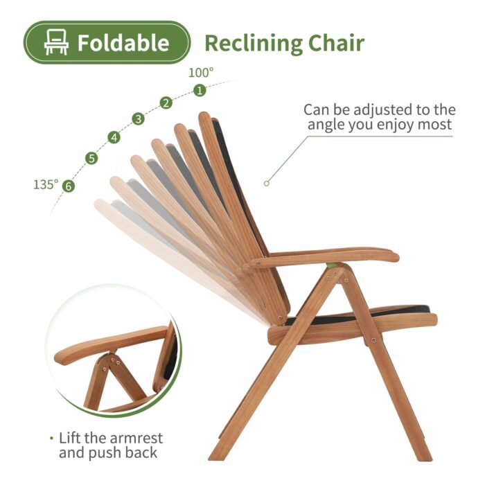OC ORANGE-CASUAL 2Pcs Foldable & Adjustable Acacia Wood Patio Dining Chairs Outdoor Reclining Chairs with Cushions