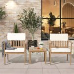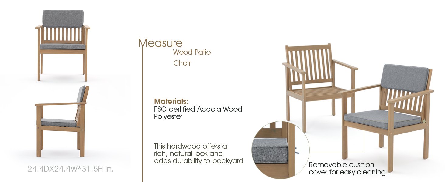 - Classic Patio Set – The Natural acacia wood look and classic design make this patio table and chairs easy to combine in various ways to integrate into your indoor and outdoor living scenarios, not only for the patio but also for the garden, porch, yard, and poolside.