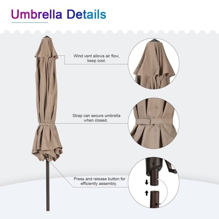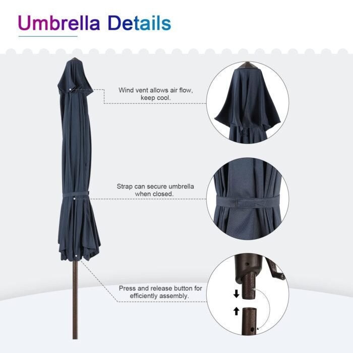 - Durable Fabric – Made of a water/UV-resistant, breathable, light-filtering polyester fabric, with an air vent that provides optimal wind resistance to keep your umbrella in place. Strap for better protection when it is closed