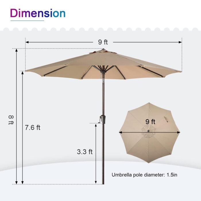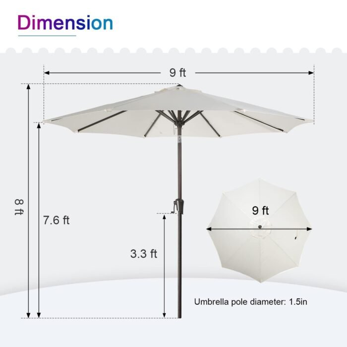 - 9 Feet Diameter-This patio umbrella is wide enough to shade your 60″ round, square, or rectangle table with 6 to 8 chairs. Ideal for both commercial and residential locations such as markets, restaurants, porch, decks, yards, balconies, pools, and any other outdoor areas