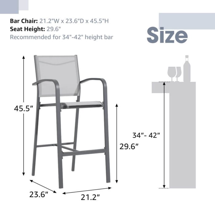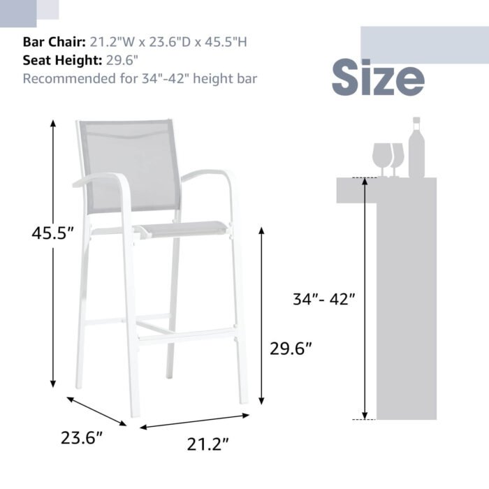 - Easy Assemble Needed – Dimension of patio tall chairs: 21.2″W x 23.6″D x 45.5″ H. With 30″ seat height, the bar stool has a tall, slim profile that can be under your bar table when not in use, perfect for small spaces. Including all hardware, and detailed instructions with all installation steps.